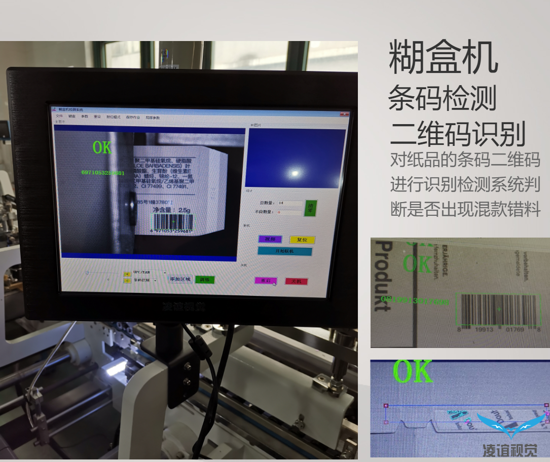 通常包裝廠生產的紙盒產品在出廠交貨前一道工序為粘盒,凌誼視覺提供的糊盒機防混貨檢測系統(tǒng)是加裝在糊盒機臺上實現在線檢測,防止粘盒混貨,識別條碼防呆,保障產品出貨品質。該粘盒防混貨檢測系統(tǒng)基于CCD機器視覺識別技術,采用高速進口工業(yè)相機設備,通過高速反應的光電感應觸發(fā),對每一個包裝盒子上的圖文、條碼、料號信息識別實時傳輸給由我公司自主研發(fā)的凌誼視覺檢測系統(tǒng),由視覺檢測系統(tǒng)進行數據對比校驗后判斷是否存在混貨串貨的情況,當檢測到混貨產品時,系統(tǒng)實時進行聲光報警同時由停機模塊輸出停機信號控制糊盒機停機,把混貨產品停在相對固定的位置,方便查找和取出。